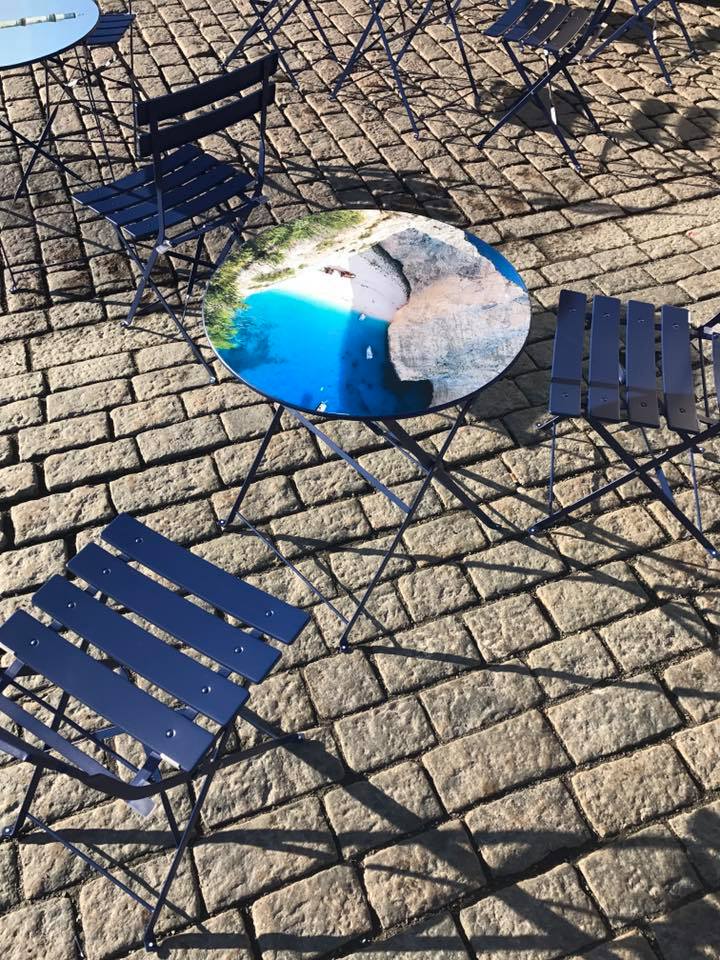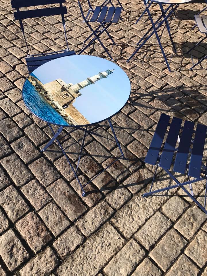 Όπως βλέπετε, στο πίσω μέρος της ταβέρνας, απεικονίζεται το λιμάνι των Χανίων. Πάνω στα γαλάζια τραπεζάκια, είναι αποτυπωμένα τοπία και στιγμιότυπα από την παράδοση του τόπου μας ενώ σερβίρονται σουβλάκι και μαγειρευτά υπό τους ήχους παλιάς ελληνικής μουσικής.